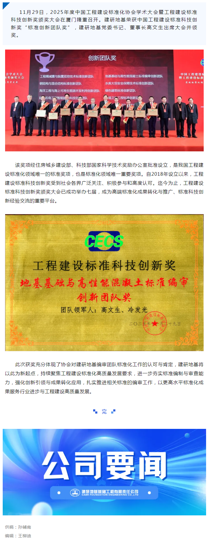 建研地基荣获中国工程建设标准科技创新奖标准创新团队奖