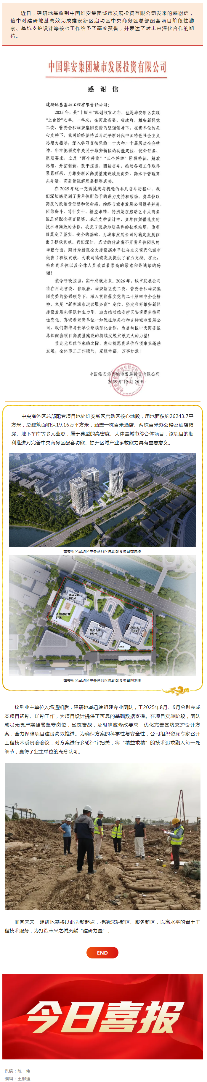 喜报 | 建研地基喜获中国雄安集团城市发展投资有限公司感谢信