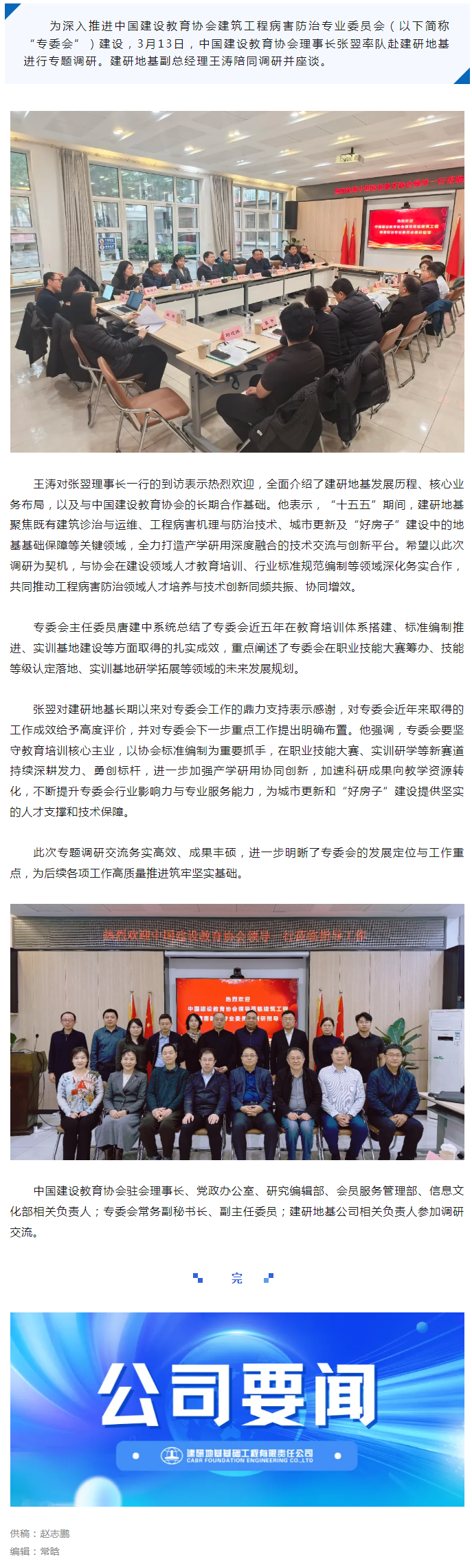 中国建设教育协会理事长张翌赴建研地基调研建筑工程病害防治专业委员会工作