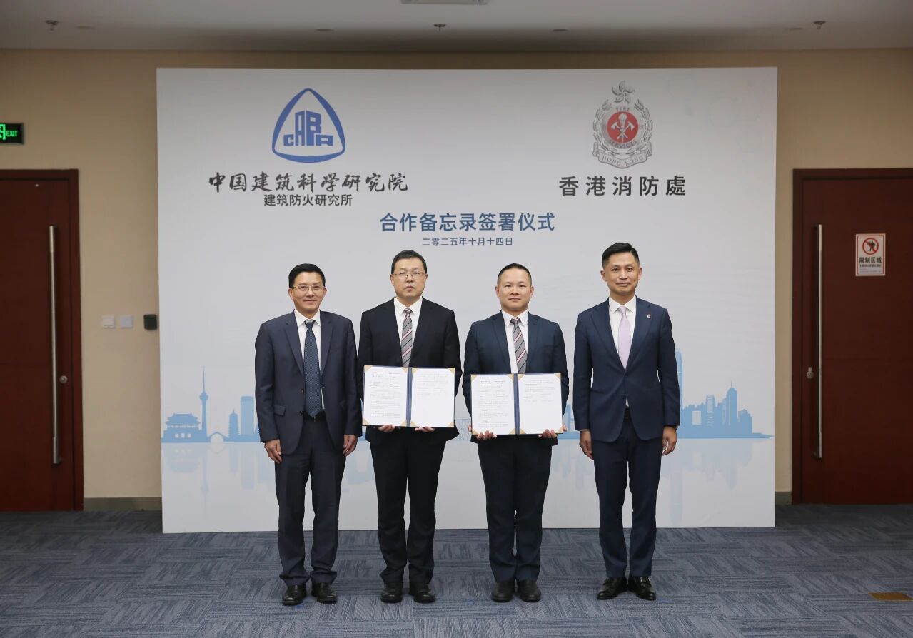 10月14日,中国建研院建筑防火研究所与香港特别行政区政府消防处(以下简称“香港消防处”)在北京举行合作备忘录签署仪式。中国建研院党委副书记、总经理樊金龙和香港消防处处长杨恩健共同见证签约,标志着双方在建筑防火安全领域的协作正式开启新篇章,将携手为两地乃至全球消防安全事业注入新动能。
