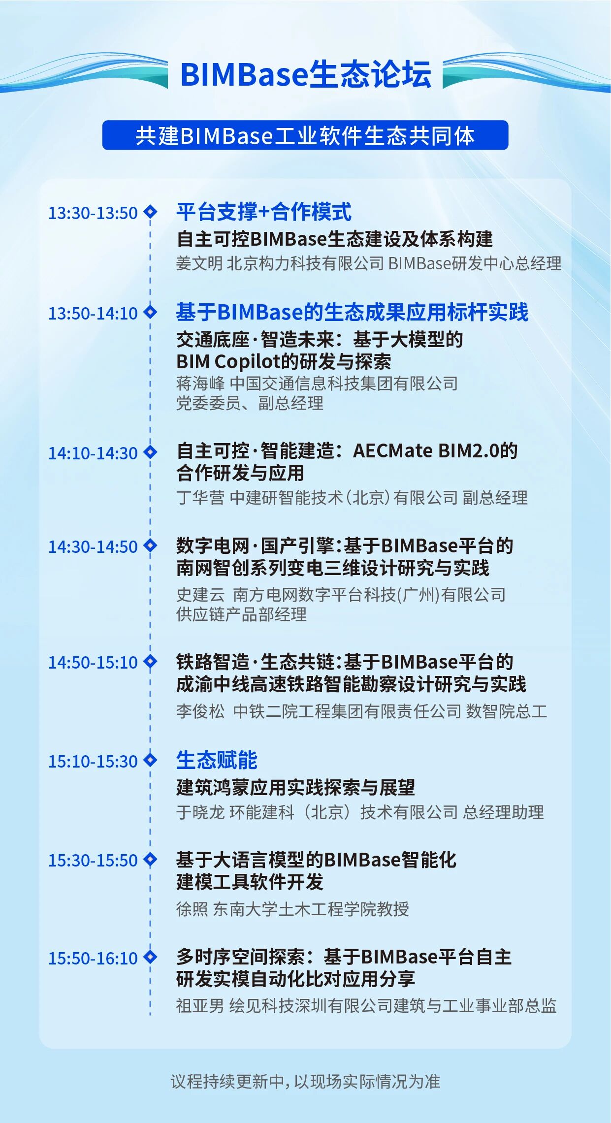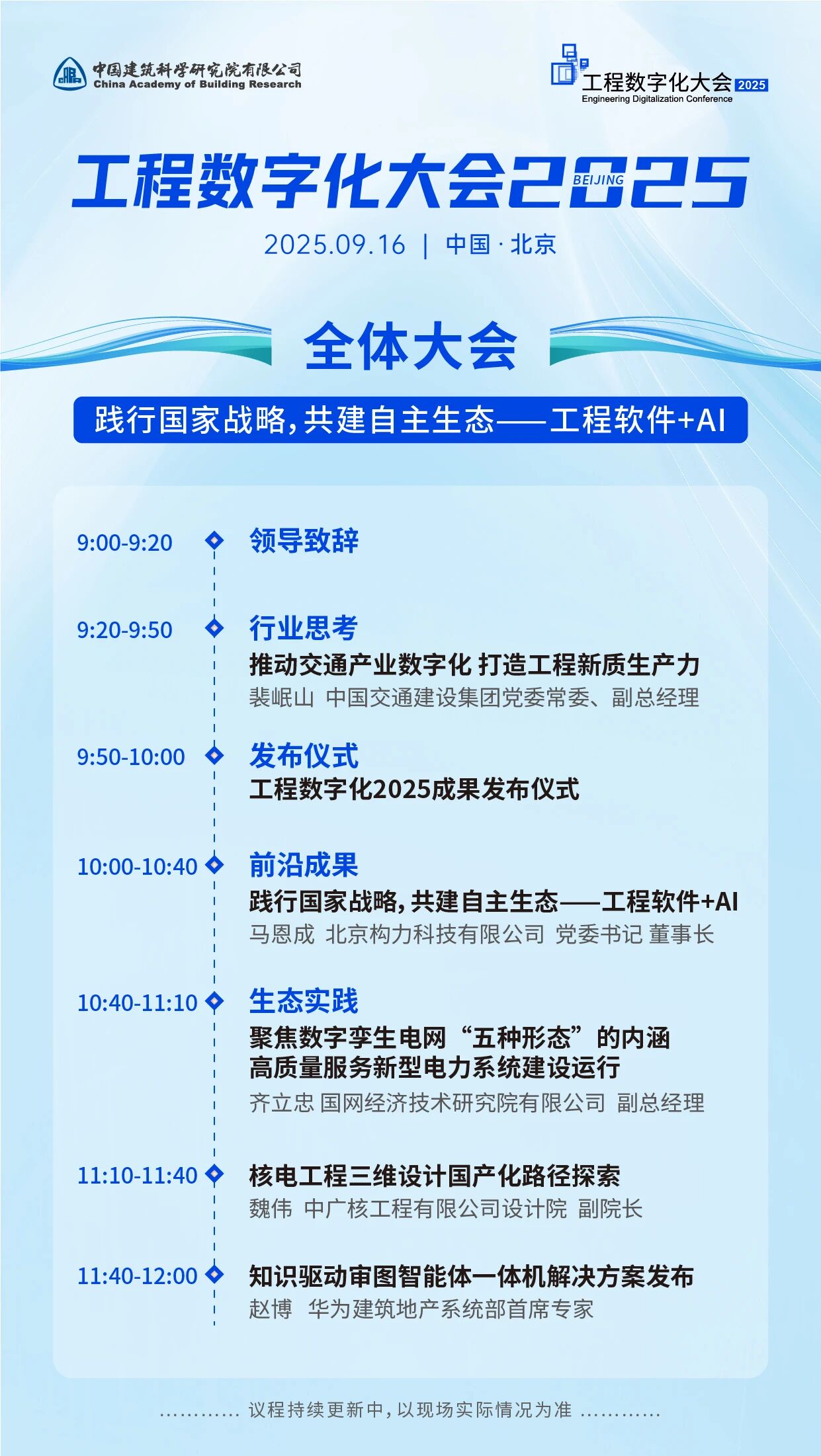 为贯彻落实党的二十届三中全会精神,响应“抓紧打造自主可控的产业链供应链、健全强化工业软件发展"要求,深化工业软件核心技术攻关、构建开放协同的国产工业软件生态,中国建筑科学研究院有限公司拟于2025年9月16日举办“工程数字化大会2025”。会议以“践行国家战略,共建自主生态——工程软件+AI”为主题,将重点聚焦工程设计软件核心价值、AI驱动的智能工程实践、BIMBase平台能力及其在工业、电力、建筑、交通等领域的国产化替代应用情况,为工程数字化发展注入新动能。诚挚邀请您莅临此次盛会!