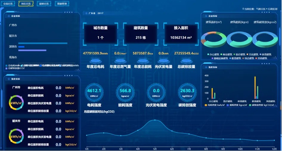 中国建研院环能科技受主管部门委托,以原住房城乡建设部公共建筑能耗数据分析平台为基础,升级开发全国大型公共建筑能碳监管平台。环能科技团队以各级政府管理需求为导向、以最新主流技术架构为手段、以支撑“双碳”落地为目标,设计了完整的分级分类能碳监测指标体系并开发相关平台。该平台能够通过多种标准数据传输协议与各省份原有监测平台对接,实现能碳数据的自动监测与采集;采用自研人工智能算法对数据进行清洗及治理,极大程度提升数据质量并确保数据格式统一标准;结合GIS地理信息技术,在全国地图中直观对比展示各省市、各区县、各建筑的能碳统计数据;依据研究形成的指标体系,实现建筑能碳统计计算、建筑能碳数据分级分类可视化展示、建筑能碳限额管理等关键功能。