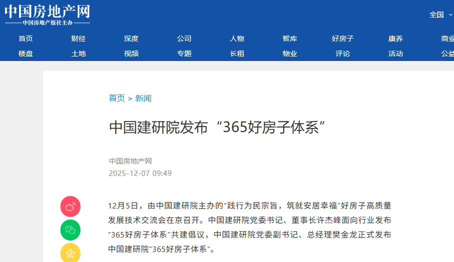 报道表示,中国建研院提出的“以技术为导向”的“365好房子体系”,是一个开放共享的成果体系,希望以此为基础,加速构建“政产学研用融”全产业链协同创新格局,以技术融合驱动产业升级,以标准引领重塑居住价值,共同推动“好房子”建设成为建筑行业高质量发展的新引擎。